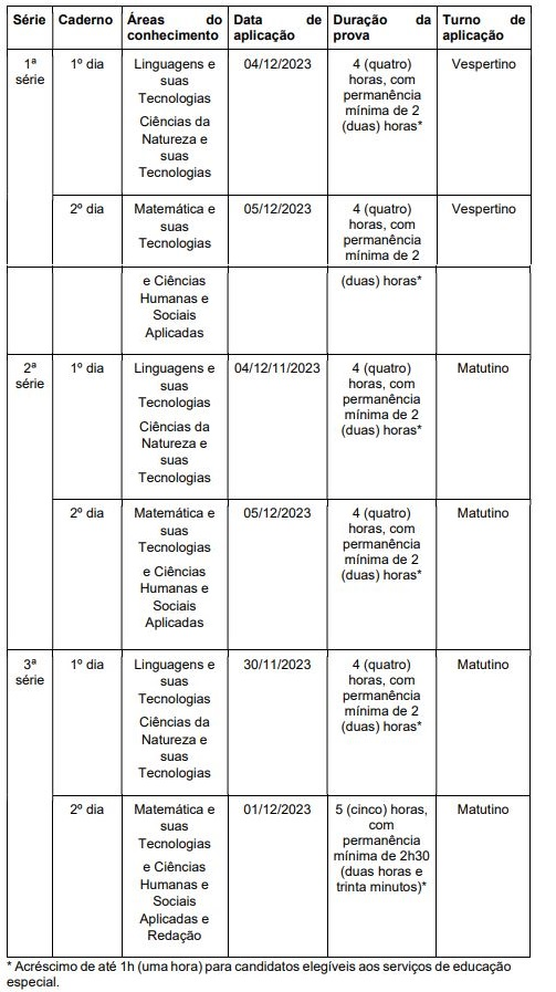 Para alunos da terceira série do Ensino Médio, as avaliações acontecem nos dias 28 e 29 de novembro, pela manhã. Os estudantes da segunda série farão a prova nos dias 30 de novembro e 1º de dezembro, no turno matutino. Já a prova direcionada para os jovens da primeira série também será realizada nos dias 30 de novembro e 1º de dezembro, mas no horário vespertino. Confira os detalhes abaixo: